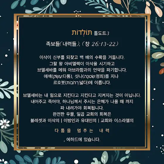 파라샤트 톨도트(족보들)3 Toldot תּוֹלְדוֹת 2025-11-18, 5786년 해쉬반월 27일