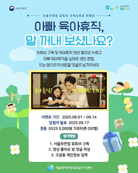 🎁서울우먼업 유튜브 구독 및 육아휴직 영상 좋아요, 댓글 이벤트🎁 "아내 육아휴직 곧 끝나는데, 이제 내가 육아휴직 신청해도 될까?" 가족과 함께 하는 그 시간, 아직 망설이고 계신가요? ✔ 아빠 육아휴직을 실제로 썼던 경험 ✔ 회사나 가족의 반응은 어땠는지 ✔ 아빠 육아휴직 사용을 아직 망설이는 이유 ✔ 내가 바라는 회사 반응 등 아빠 육아휴직에 대한 여러분의 경험과 바람을 댓글로 자유롭게 들려주세요! 공감 가는 댓글을 추첨해 GS25 5천원권을 50명에게 드립니다. 📝 참여 방법 ① 서울우먼업 유튜브 채널 구독 ② 아빠 육아휴직 영상에 좋아요 및 댓글을 남기고 ③ 아래 구글폼을 작성해주세요 🔗영상 링크 : https://youtu.be/q5r29m4vDWw 🔗참여자 정보 입력 링크 : forms.gle/LneN3N95RAhneho1A 📅 이벤트 기간 : 2025년 9월 1일 ~ 9월 14일 📢 당첨자 발표 : 2025년 9월 17일 🎁 경품 : GS편의점 모바일 금액권 5천원(50명 추첨)