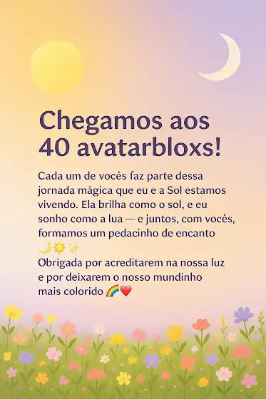 ✨️hoje o meu coração brilha de alegria! 🌞🌙 já somos 40 avatarbloxs e cada um de vocês faz parte dessa história cheia de sonhos, risadas e magia 💖 eu e a sol estamos muito felizes por ver nosso mundo crescendo e se enchendo de cor 🌈 que venham muitos momentos lindos ao lado de vocês! 🌸💫
