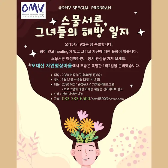 9월에 만나는 옴뷔 특별 프로그램스물 서른, 그녀들의 해방 일지오대산의 9월은 참 특별합니다.쉼이 있고 healing이 있고 자신에 대한 돌봄이 있습니다.스물 서른 여성이라면.... 잠시 관심을 가져 보세요.오대산 자연 명상마을에서 조금은 특별한 1박 2일을 준비했습니다.- 대상: 2030 여성 누구나(40명 선착순)- 일시: 2025년 9월 12~13일(1박2일)- 내용: 2030 여성 '괜찮은 나" 자기 탐색 프로그램- 신청: 전화 예약만 가능- 문의: 033.333.6500/omv6500@naver.com