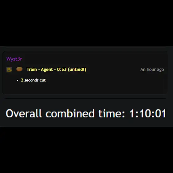 Wyst3r has done it. Train Agent 53, a two second time cut, bringing GoldenEye's total time down to 1:10:01.You can watch the run here: https://www.youtube.com/watch?v=PfI3t...The barrier could be broken any day now...