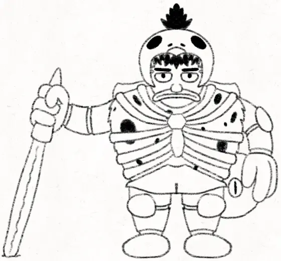 Despite only speaking very simply worded sentences, he’s very intelligent in terms of wilderness survival. His armor, shield, and blade are all crafted from bones; the latter of which is sheathed with an extremely dense wooden club.