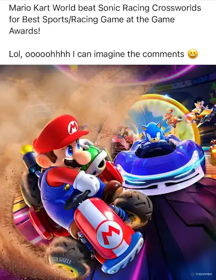 Well my brothers of Sonic fandom we have lost yet again to the Mario Kart team only for it to be a very good comeback for Mario winning another Game Awards record streak twice with Mario Wonder LMAFO🤣😂💀💀