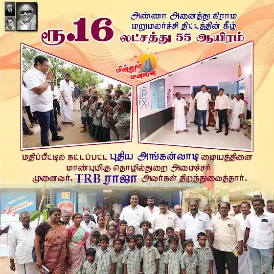 மன்னார்குடி சட்டமன்ற தொகுதி, கோவில்வெண்ணி ஊராட்சி, மணலூர் கிராமத்தில், அண்ணா அனைத்து கிராம மறுமலர்ச்சி திட்டத்தின் கீழ், ரூ.16 லட்சத்து 55 ஆயிரம் மதிப்பீட்டில் கட்டப்பட்ட புதிய அங்கன்வாடி மையத்தினை மாண்புமிகு தொழில்துறை அமைச்சர் முனைவர். TRB ராஜா அவர்கள் மக்கள் பயன்பாட்டிற்கு திறந்துவைத்தார்.