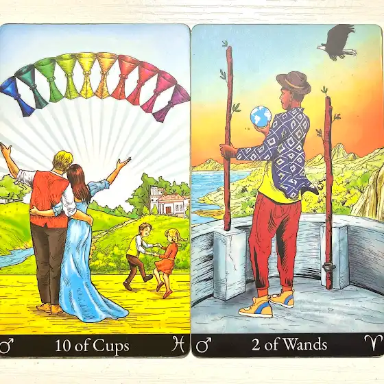 10 of Cups- ultimate happiness, divine love, highest joy, dream fulfilled, passed on loved ones 2 of Wands- planning, looking at a doorway, realizing the way, making a way