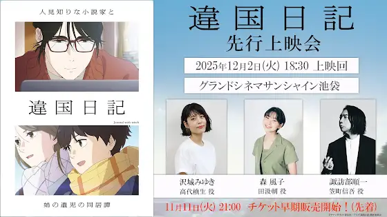 ━━━━━━━━━━━🌱꙳⋆ 『 #違国日記』 先行上映会開催決定⋆꙳💫━━━━━━━━━━━本日、11/11(火)21:00チケット早期販売開始!劇場オンライン:一般販売11/12(水)0:00~劇場窓口:11/12(水) 劇場オープン時~※先着順ですので予定枚数に達し次第受付終了となります※劇場オンライン販売にて完売になった場合、窓口販売はございません登壇:#沢城みゆき #森風子 #諏訪部順一🗓️12/2(火)📍グランドシネマサンシャイン池袋詳細🔽 ikoku-anime.com/news/post-9