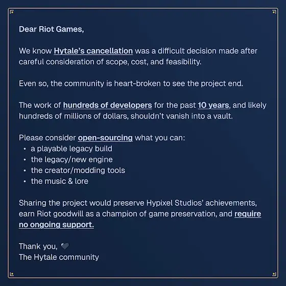 La comunidad está rogandole ahora a Hypixel y Riot de que reconsideren su decisión, se hizo esta imagen y se está compartiendo bajo el hashtag de #SaveHytale Solicitando que al menos se libere el motor antiguo del juego junto a lo que sea que haya sido jugable en el momento, pero esto será dificil de conseguirlo creo yo. Aún asi, me alegra que Hytale siga pisando fuerte. Ahora ando lamentablemente ocupado con estudios, pero sepan que cuanto antes haré un video de todo esto Voy a retrasar la despedida de Hytale, porque parece que todavía no va a ningún lado...