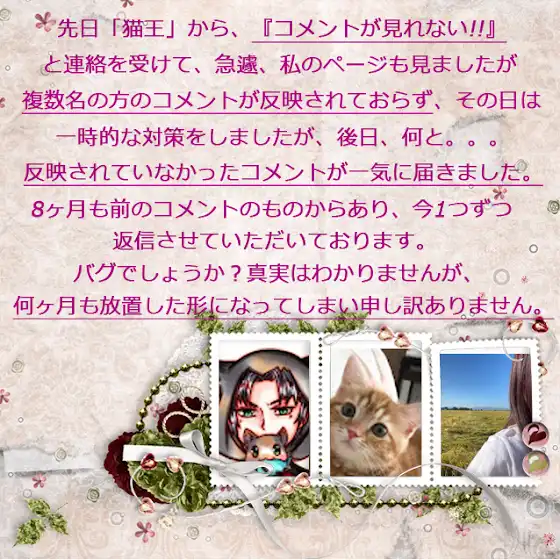 反映されていなかったコメントが一気に届きました。8か月前からのコメントもあり、今、1つずつ返信させていただいております。バグかもしれませんが、何か月も放置した形になり、申し訳ありませんでした。