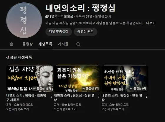 안녕하세요 여러분. 오늘도 여러분과 함께하는 시간, 내면의 소리, 평정심 입니다. 영상이 제법 쌓여서 "재생목록"을 만들었습니다. 단편영상, 장편영상, 집중탐구 시리즈로 구성되어 있습니다. 특히 집중탐구 시리즈는 순서대로 시청할수 있게 해놨으니 많은 시청해주세요.구독해주신 구독자님들 사랑합니다. 😊