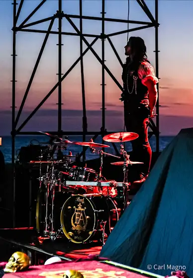 Beach Sunset pls help decrease my melatonin suppression sensitivity 💤😴•📸: @carl_magno__ 🎻: @FleshgodApocalypse 📍: Italy 🇮🇹• Pearl Drums Europe Pearl Drums Paiste Cymbals #drums #drummer #fleshgodapocalypse #Italy #tournament