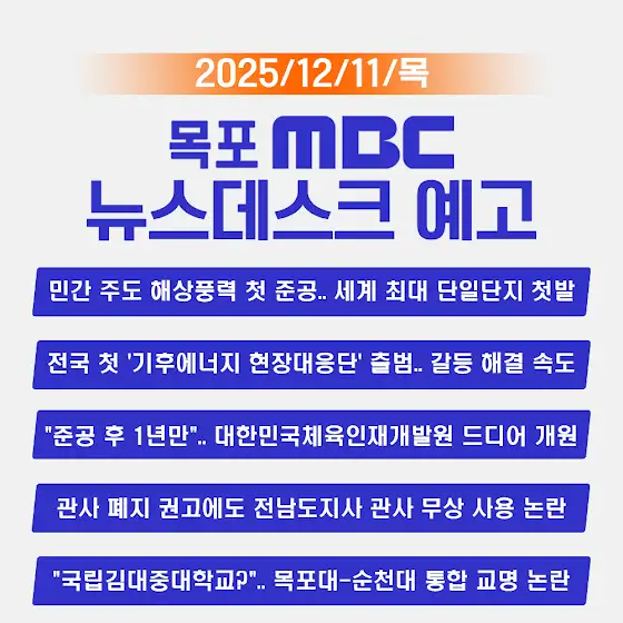 12월 11일 목요일 밤 7시 40분, 목포MBC 뉴스데스크에서#민간 주도 해상풍력 첫 준공..세계 최대 단일단지 첫발 #전국 첫 '기후에너지 현장대응단' 출범..갈등 해결 속도 #"준공 후 1년만"..대한민국체육인재개발원 드디어 개원 #관사 폐지 권고에도 전남도지사 관사 무상 사용 논란 #"국립김대중대학교?"..목포대-순천대 통합 교명 논란