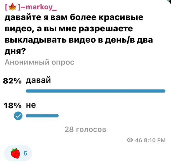 ребята из тг канала дали мне позволение делать более красивые видео но выкладывать одно раз в день/в два дня. вот так вот