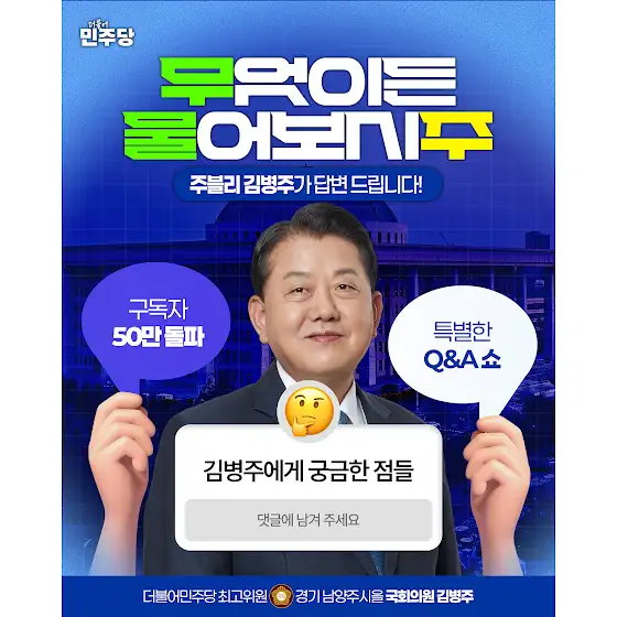 [ 무엇이든 물어보시주!🙋🏻♂️ ]육군대장, 재선 국회의원, 여당 최고위원,그리고 어느덧 '50만 유튜버'가 된 주블리 김병주!사소한 질문부터 정말 궁금했던 질문들까지구독자 여러분의 모든 질문을 기다립니다!'댓글'로 편하게 물어봐 주세요!주블리 김병주가 영상으로 직접 답변드립니다!#실버버튼개봉식 #50만구독기념 #주블리김병주