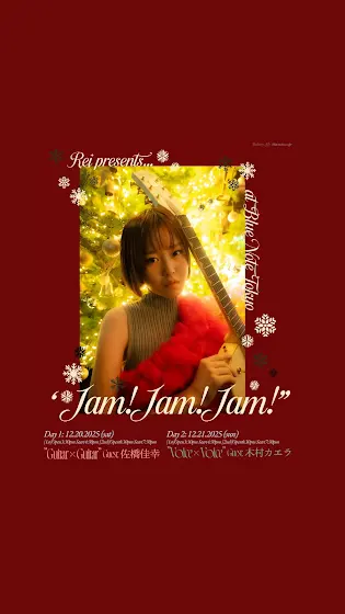 《GIGS》Rei presents “JAM! JAM! JAM!” 2025 のビジュアル第二弾解禁🎄Blue Noteにて撮影したメインビジュアルいかがですか?いよいよ来週に迫りました、Reiが贈る年に一度のスペシャル・セッション。ゲストに佐橋佳幸さん、木村カエラさんをお迎えします。今年は2デイズ各日1st/2nd開催。ぜひお越しください🍇TICKETS:www.bluenote.co.jp/jp/artists/rei/▶︎12/20(土)Guitar × Guitar 🎸ゲスト:佐橋佳幸[1st]Open3:30pm Start4:30pm[2nd]Open6:30pm Start7:30pm▶︎12/21(日)Voice × Voice 🎤ゲスト:木村カエラ[1st]Open3:30pm Start4:30pm[2nd]Open6:30pm Start7:30pm»»————NEXT————-««🔵Rei presents "JAM!JAM!JAM! 2025"📍 BLUE NOTE TOKYO🍇Rei 10th Anniversary Acoustic Tour 2025“Mahogany Girl🎫再販売中・イープラス:eplus.jp/rei/・ぴあ:w.pia.jp/t/rei-tour2025/・ローチケ:l-tike.com/rei/📍愛知・Tokuzo2026年1月18日(日) open 16:00 / start 17:00📍東京・ヒューリックホール東京2026年1月21日(水) open 18:00 / start 19:00🍐10th Anniversary Final"Rei at THEATER MILANO-Za"2026.3/7(土)3/8(日)📍THEATER MILANO-Za🎫eplus.jp/rei/#10thRei