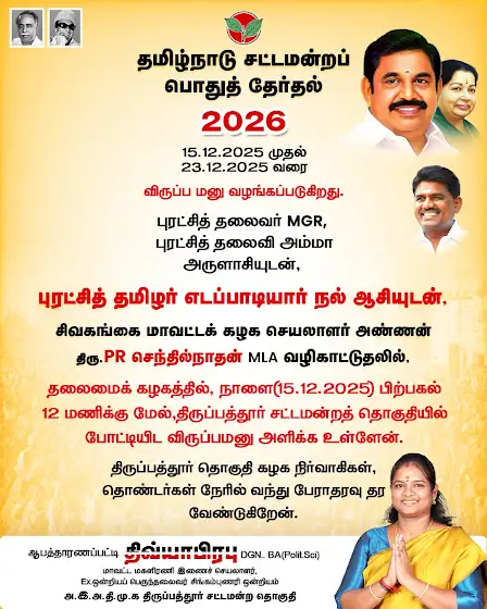 புரட்சித் தலைவர் MGR, புரட்சித் தலைவி அம்மாஅருளாசியுடன்,புரட்சித் தமிழர் எடப்பாடியார் நல் ஆசியுடன், சிவகங்கை மாவட்டக் கழக செயலாளர் அண்ணன் திரு.PR செந்தில்நாதன் MLA வழிகாட்டுதலில்,தலைமைக் கழகத்தில், நாளை(15.12.2025) பிற்பகல் 12 மணிக்கு மேல்,திருப்பத்தூர் சட்டமன்றத் தொகுதியில் போட்டியிட விருப்பமனு அளிக்க உள்ளேன்.திருப்பத்தூர் தொகுதி கழக நிர்வாகிகள், தொண்டர்கள் நேரில் வந்து பேராதரவு தர வேண்டுகிறேன்.#AIADMK #DMKFailsTN #EdappadiPalaniswami #TNWithEPS #புரட்சித்தமிழரின்_எழுச்சிப்பயணம் #மக்களைக்_காப்போம் #தமிழகத்தை_மீட்போம் #EPSFORTN