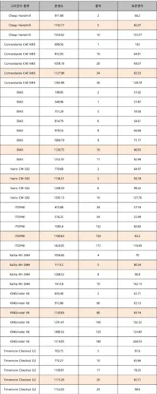각 그라인더 별 분쇄도를 찍어봤습니다평균 4번 정도 찍어서 자료 정리해봤습니다코만단테 기준 24클릭을 기준으로 음영 표시을 해드렸습니다제가 올린 영상의 분쇄도를 확인하실때참고하시면 좋을듯 해서 공유드려요