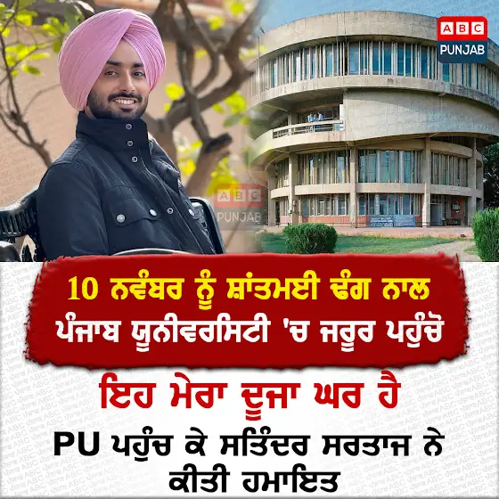 10 ਨਵੰਬਰ ਨੂੰ ਸ਼ਾਂਤਮਈ ਢੰਗ ਨਾਲ ਪੰਜਾਬ ਯੂਨੀਵਰਸਿਟੀ 'ਚ ਜਰੂਰ ਪਹੁੰਚੋ ਇਹ ਮੇਰਾ ਦੂਜਾ ਘਰ ਹੈPU ਪਹੁੰਚ ਕੇ ਸਤਿੰਦਰ ਸਰਤਾਜ ਨੇ ਕੀਤੀ ਹਮਾਇਤ#abcpunjab #satindersartaaj #singer #panjabuniversity