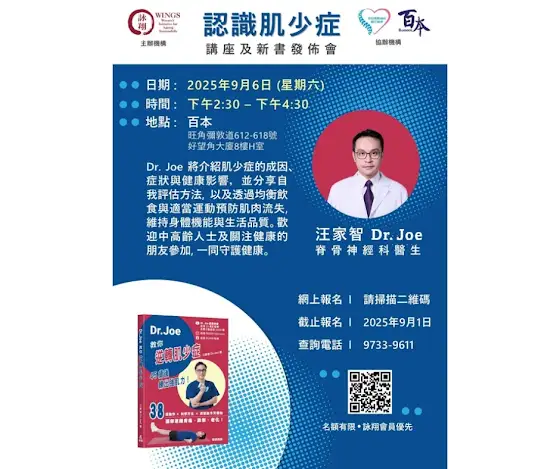 #詠翔(香港)將於9月6日在旺角 #百本 healtHUB 舉辦 #DrJoe《#認識肌少症》講座暨新書發佈會📘。