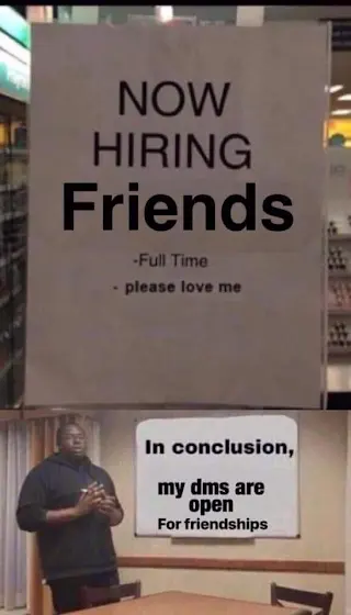 Ok so I am hiring friendsππ (for discord of course) Requirements: Must be active Love music a little or alot Must have discord Be yourself please lob me Age-13 to 15 Can be any gender or sexuality Be funny and chaotic If you can