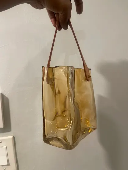 It’s in the shape /structure of a purse and it’s so beautiful…and made with heavy duty glass and a leather strap is attached. Such art!
