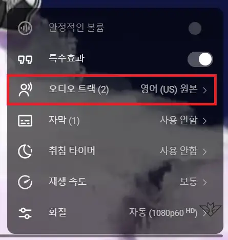 오디오 트랙을 '영어(US) 원본'으로 바꾸면 정상적으로 들리니 참고해주세요!