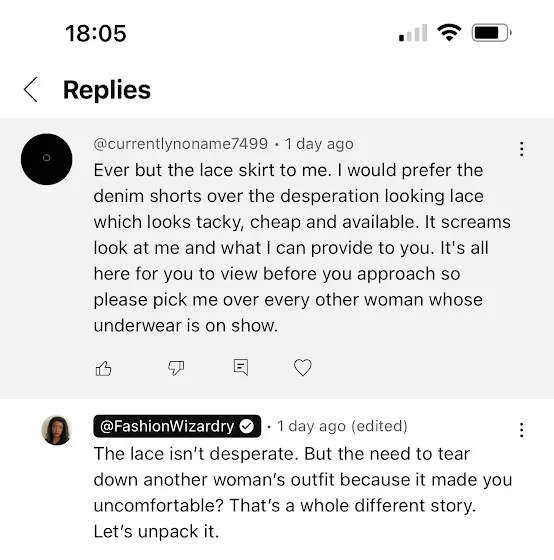 Because I’m tired. Tired of people policing women’s clothes through the lens of respectability. Of confidence being mistaken for desperation. Of sensuality being treated like it’s something we should apologize for.