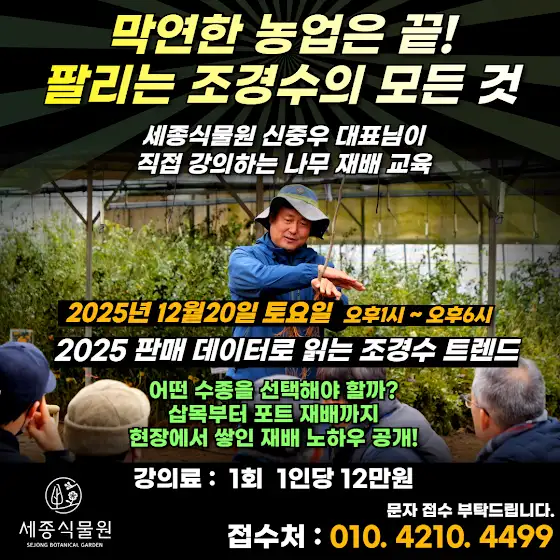 12월 2일 토요일 오후 1시부터 6시 까지 세종식물원 신중우 대표의 강의가 진행됩니다. 강의료는 1인당 12만원 입니다.2025년 실제 판매량으로 보는 조경수 시장의 흐름과 그리고 2026년 트렌드 전망까지농원을 시작할 때 어떤 수종을 선택해야 할지삽목부터 포트 재배까지현장에서 쌓인 재배 노하우 공개합니다!경기 흐름에 따라 달라지는 수종 선택 전략까지!막연한 농업이 아닌팔리는 조경수를 알고 싶다면이번 강의를 놓치지 마세요!