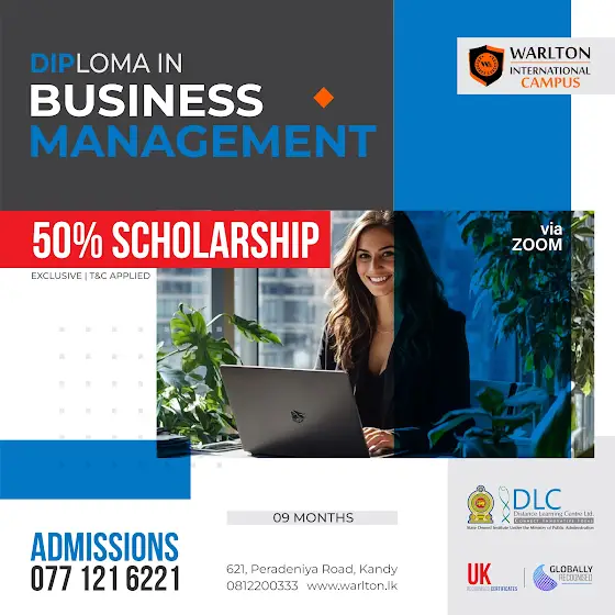 🚀 Diploma in Business Management – 50% Scholarship Available!Develop the essential skills in leadership, strategy, and decision-making to thrive in the business world and boost your career opportunities.📚 6-Month Program | Online & Physical Classes | UK & Globally Recognized Certification📍 Warlton International Campus – Kandy📞 Call Now: 077 121 6221 | 081 220 0333.....#BusinessManagement #ManagementSkills #LeadershipDevelopment #BusinessDiploma #Entrepreneurship #CareerOpportunities #BusinessSriLanka #KandyEducation #StudyInSriLanka #WarltonInternationalCampus #FutureLeaders #ScholarshipAvailable #BlendedLearning #OnlineClasses #PhysicalClasses #CareerBoost #UKRecognized #GloballyRecognized