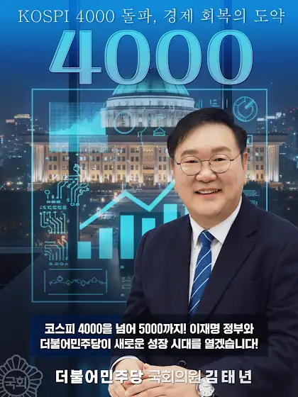 <코스피 4000 돌파, 희망은 현실이 됩니다>오늘, 코스피 지수가 사상 처음으로 4000선을 돌파했습니다.지난 6월 20일 3000선을 넘어선 지 불과 129일 만의 쾌거입니다.3000을 넘어 쏘아올린 희망의 신호탄이이제 눈앞의 현실로 돌아왔습니다.“대통령이 바뀌니 나라가 달라졌다.”는 말은자화자찬용 수사가 아니라, 현실이 되었습니다.긴 어둠의 시간을 지나대한민국은 다시 찬란한 빛의 시대로 나아가고 있습니다.정부의 노력, 기업의 혁신, 국민의 헌신이 함께 만들어낸 결과입니다.코스피 4000은 끝이 아닙니다.더 큰 도약, 코스피 5000 시대를 향해 나아가겠습니다.이재명 정부와 더불어민주당은 합니다.경제는 민주당입니다.