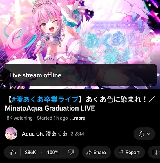 【速報】阿夸 OBS 按了關台之後 YouTube 就忘記按了 已經超過十分鐘了 希望可以這樣一直延畢下去 明天繼續玩 Apex Aqua has forgot to turn off her stream. She did turn off OBS but forgot to end stream on YouTube, so the stream is offline but not ended. Hope this continues until tomorrow where she streams Apex. あくたんが配信を切るのを忘れました。OBS は閉じたけど YouTube には配信切ってないから今もオフラインのままです。 このまま卒業やめて、明日も Apex 配信すればいいな。