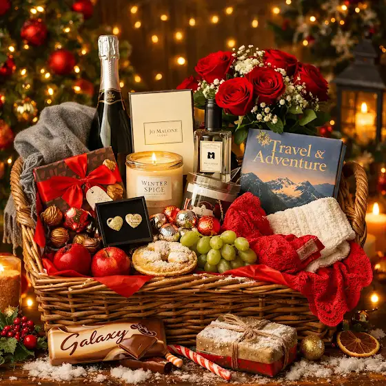 Her favourite sweets, a bottle of wine, prosecco, or whatever she drinks. Add in a scent or skincare product she already uses. Something soft and comforting—maybe socks, a scarf, or a robe.