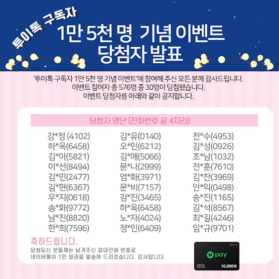 투이톡 구독자 1만 5천 명 기념 이벤트 당첨자 발표! 이벤트 참여자 총 576명 중 30명이 당첨됐습니다. 모두 축하드립니다.당첨되신 분들께는 남겨주신 휴대전화 번호로네이버페이 1만 원권을 발송해 드리겠습니다. 감사합니다.