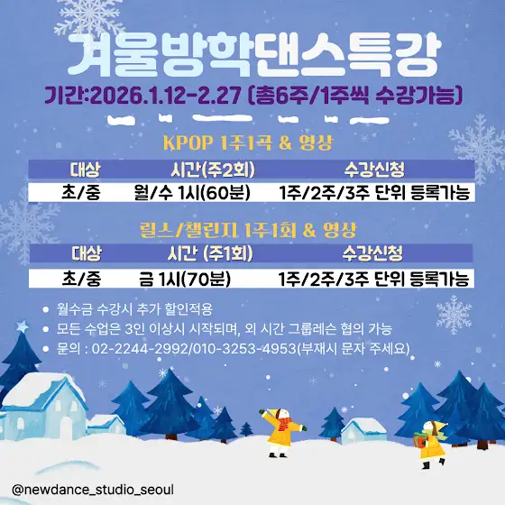 ☃️ 추운 겨울~ 움직이기 싫은 우리 친구들^^긴 겨울방학 가벼운 마음으로 kpop/ 릴스 class를 시작해 보세요~ 다양한 음악과 함께 스트레스도 날리고 땀도 흘리며 건강한 방학을 보내세요🤗