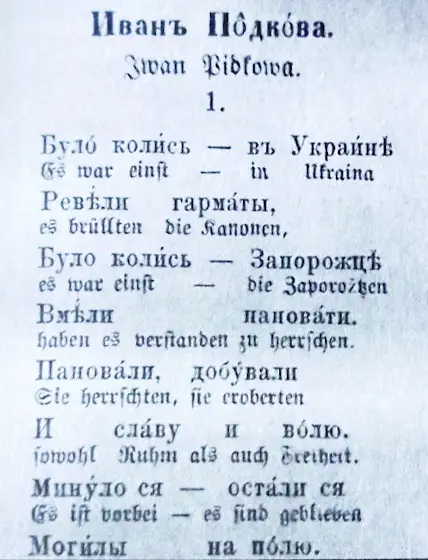 Німецький посібник для вивчення малоруської (рутенської) мови з наведенням українських пісень, які співали австрійські солдати-українці, 1890-ті роки. Взято тут: t.me/thelandofRuthenia
