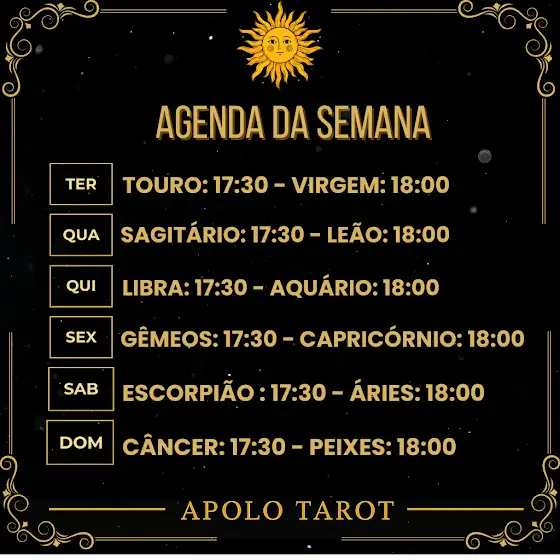 Esta será a nova agenda da semana. A partir deste horário, os signos serão postados. Peço desculpas pelo atraso de alguns vídeos, mas sempre que houver qualquer imprevisto ou problema, eu aviso por aqui.