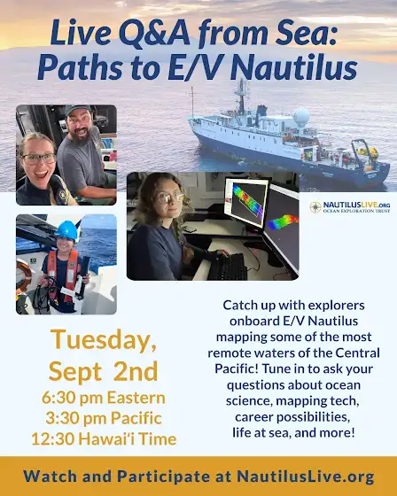 Join us for a LIVE #QandA with those at-sea onboard #EVNautilus on Tuesday, September 2 and learn how our #CorpsofExploration became #oceanexplorers. Tune in and submit your questions at Nautiluslive.org