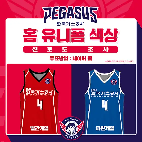 [홈 유니폼 색상 선호도 조사]🏀22-23시즌 홈 유니폼 제작에 대한, 팬 분들의 의견을 적극 반영하고자 합니다🏀이번 시즌 선수들이 입고 뛸 유니폼 색상을 직접 선택해 보세요!🎁투표 해주신 팬분들 중 추첨을 통해 20분에게 2층 초대권 2매를 경품으로 드립니다!많은 참여 부탁드립니다🎉[네이버폼 링크 : naver.me/5i9I6uCS]✔참여방법 : 네이버폼 (프로필 상단 링크트리 혹은 네이버 주소)✔️참여기간 : 2022년 7월 25일(월) - 2022년 8월 2일(화)✔경품 : 2층 초대권 2매 (20명, 40매)🎁*초대권 예매번호 9월 중 이메일 통해 발송#유니폼색상_선호도조사#한국가스공사페가수스#한국가스공사 #페가수스#KOGAS #PEGASUS