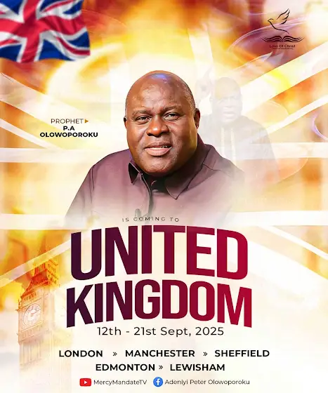 π₯ The UK Revival Tour is Here! π¬π§Join Prophet P.A. Olowoporoku of Love of Christ Ministry Date: 12thβ21st September 2025 Across the United Kingdom for a prophetic encounter like never before!π London | Manchester | Sheffield | Edmonton | Lewisham.Address will be out in few days, anticipate this great outpouring coming your way.Miracles, healing, divine direction, and prophetic outpouring await you!π₯ Watch live on @MercyMandateTVπ² Stay connected: Adeniyi Peter Olowoporoku#ukrevival2025 #prophetpaolowoporoku #loveofchristministries #mercymandatetv #prophetictour #londoncrusade #manchesterrevival #sheffield #lewisham