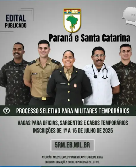 #5RM #MilitarTemporário #ExércitoBrasileiro #ProcessoSeletivo2025 #SantaCatarina #Paraná #ServiçoMilitarTemporário #ConcursoMilitar #OficialTemporário #CaboTemporário #SargentoTemporário