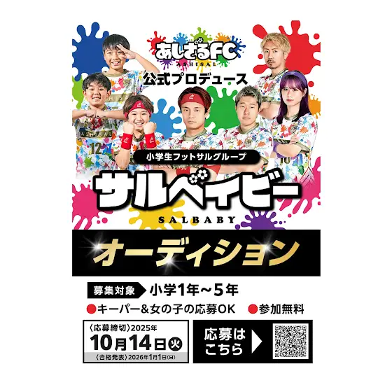 あしざるFC公式プロデュース小学生フットサルグループ【サルベイビー】のオーディションを開催します!応募対象は小学1年生〜5年生フィールドプレイヤー・キーパー(女の子の参加もOK)です!応募期間は10月14日(火)まで!応募フォームはこちら⬇︎docs.google.com/forms/d/1eQs1jMJaL3OQUHOC4iXV4BiLO…