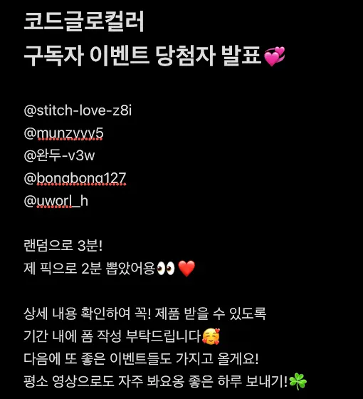 ๐ผ์ฝ๋๊ธ๋ก์ปฌ๋ฌ ์ด๋ฒคํธ ๋น์ฒจ์ ๋ฐํ๐ผ((๋น์ฒจ์ ์์ 19:18))@stitch-love-z8i@munzyyy5@์๋-v3w@bonabona127@๊ตฌ๊ณ ์-q3z ((๊ธฐ์กด ๋น์ฒจ์ ๋ถ์ ์๊ฒฌ์ผ๋ก ์ ๋น์ฒจ์๋ฅผ ๋ฝ์์ต๋๋ค๐ฎ))๋น์ฒจ๋์ ๋ถ๋ค ๋ชจ๋ ๋~~๋ฌด ์ถํํ๊ณ !์ ํ ๋ฐฐ์ก์ ์ํ ์ ๋ณด๋ํผ์ผ๋ก ๊ผญ ๊ผผ๊ผผํ๊ฒ ์์ฑ ๋ถํ๋๋ ค์!โ forms.gle/FYcVkWtA6qE8E7U59๐๏ธ ํผ ์์ฑ ๊ธฐ๊ฐ06.13 ~ 06.17๊น์งํด๋น๊ธฐ๊ฐ ๋ฏธ๊ธฐ์ฌ ๋ฐ ์ฃผ์ ์ค๊ธฐ์ฌ์ ์ฌ๋ฐ์ก์ด ์ด๋ ค์ฐ๋ํ์ธ ๋ ๋ฒ ์ธ ๋ฒ ๋ค ๋ฒ.... ์ด ๋ฒ!!!!!๐ฅฒโค๏ธโค๏ธP.S. ์๋ฟ ๋๊ธ ์์ ๋๊ธ ์ ํ ๊ด๋ จ ๊ธฐ๋ ๋๋ค ๋คใ ใ ๋ดค์ค ์ฌ๋ํดใ ใ ใ ์