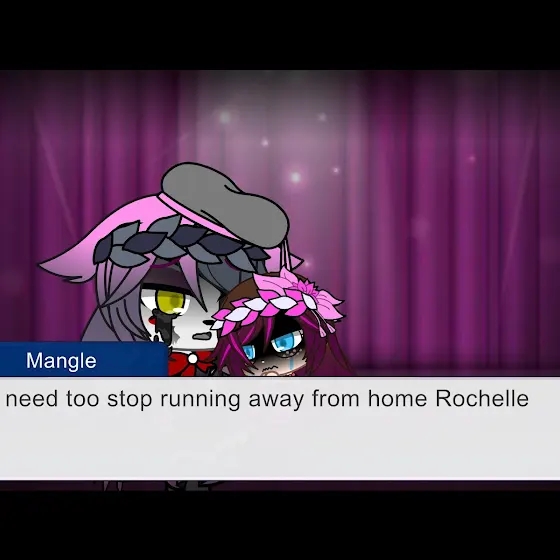 Some more lore between mangle and the child that soon would posses her her name is Rochelle who’s going through a hard time at home so she tends to every single night run away from home and head to Freddy’s and she always would run to Mangle and mangle tells her she has to stop running away because she could get hurt or worse (foreshadowing) but the workers would just only repair mangles voice box but nothing else so that’s why she is able to speak here but Rochelle’s parents are either going through a divorce or her father has become temperamental and angry every time she can hardly sleep at night with her parents arguing so that’s why she runs to Freddy’s she tends to feel safer there then at her. Home and chica tends to find Rochelle with mangle she’s also shows concern for the lovely girl and mangle always begs chica not to tell Freddy because if he found out mangle would lose one of her friends and Rochelle loses her safety and favourite animatronic because Freddy says mangles a danger to every single human and that she shouldn’t be around people so here’s some more lore i may or may not make a video on this but anyways hopefully this isn’t a trigger to others