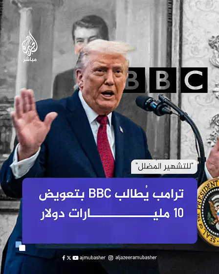 أقام الرئيس الأمريكي دونالد #ترامب دعوى قضائية في ولاية #فلوريدا ضد هيئة الإذاعة البريطانية (BBC)، مطالبا بتعويض لا يقل عن 10 مليارات دولار بتهمتي التشهير وانتهاك قوانين الممارسات التجارية الخادعة. على خلفية مقطع مضلل أظهر ترامب وكأنه يدعو إلى "عمل عنفي" قبيل اقتحام مبنى الكابيتول في يناير/كانون الثاني 2021.