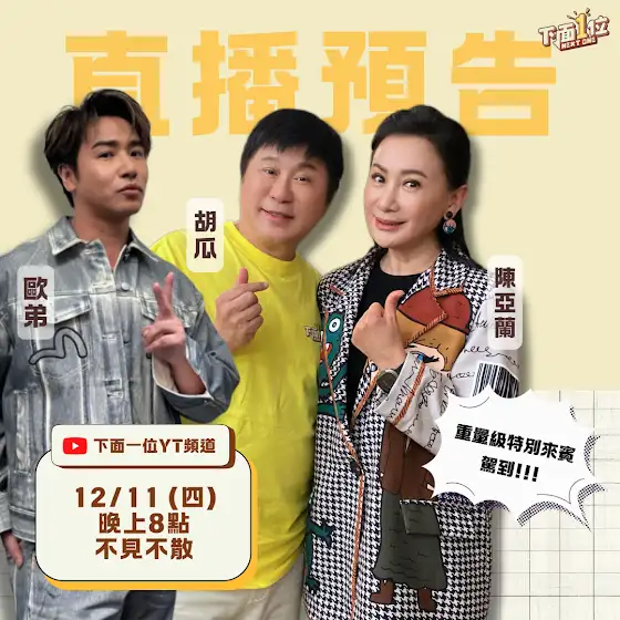 ✨醬醬醬醬~~ 讓我們歡迎歐弟和陳亞蘭加入我們的直播😍😍 😍 大家有沒有猜對呢!趕快叫上親朋好友來看直播吧~~ 絕對不要錯過這次的三人合體直播唷🥳🥳 有什麼想問的問題都可以直接在留言區告訴我們!! 📆日期:12/11 (四) 晚上8點 📍直播平台:下面一位YT頻道