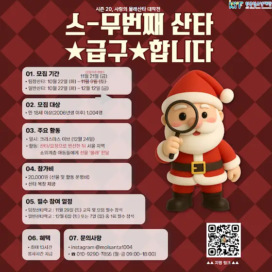 β€οΈπμ€Xνκ΅μ²μλ μ¬λ¨μ μ¬λμ λͺ°λμ°ν λμμ πβ€οΈμ κΈ°λλ€β‘μ κ° μλ μ μ΄μ΄ μ¬ν΄λ νκ΅μ²μλ μ¬λ¨μμ μ§ννλμ¬λμ λͺ°λμ°ν λμμ ν보λ₯Ό λ§‘κ² λμμ΅λλ€β¨μλ μλ λ΄μ¬νλ λ§μμΌλ‘ μμμ λ§λ€μλλ°μ¬ν΄λ λ€μ ν¨κ»νκ² λμ΄ μ λ§ μκ΄μ΄μ¬μπμ΄λ² μμμ λ€λ₯Έ κ³³μμλ νμ©νκ³ μΆλ€κ³ νμ μμ‘°κΈ λ 곡μ΅κ΄κ³ λλμΌλ‘ μ μλμμ§λ§κ°μ₯ μ νκ³ μΆμ λ©μμ§λ λ¨ νλμ λλ€πνκ΅μ κ³μ μ°λ¦¬ μ κΈ°λλ€κ»μν¬λ¦¬μ€λ§μ€μ νλ‘ νΉμ μ¬λνλ μ¬λκ³Ό ν¨κ»λκ΅°κ°μκ² λ°λ»ν λ§μμ μ νλμμ μΆμ΅μ λ¨κΈ°μ ¨μΌλ©΄ ν΄μπμλ μλ 1004λͺ μ μ²μ¬λ₯Ό λͺ©νλ‘ νκ³ μ λ§ λ§μ μ κΈ°λλ€μ΄ λμ°Έν΄ μ£Όμ ¨λλ°μπ π»μ¬ν΄λ μ°λ¦¬ μμ΄λ€μκ²μμ§ λͺ»ν λ°λ»ν ν¬λ¦¬μ€λ§μ€λ₯Ό μ λ¬Όν΄ μ€!μλΉ μ°νλλ€μ λͺ¨μ§ν©λλ€!πν¬λ¦¬μ€λ§μ€ μ΄λΈμ΄λ³΄λ€ λ λ»κΉμ μΆμ΅μβ¦ μμ κ² κ°μμπμλ λͺ¨μ§ κ³΅κ³ μ½μ΄λ³΄μκ΅¬κΌ ν λ² μ°Έμ¬ν΄μ£ΌμΈμ©!β₯β€οΈπ€Άπ»μ°λ¦¬ μ°ννμπ€Άπ»β€οΈν¬λ¦¬μ€λ§μ€ μ΄λΈμ 1,004λͺ μ μμ΄λ€μκ² μμ§ λͺ»ν λ°λ»ν κΈ°μ΅μ μ λ¬Όνλ¬ κ°μ¬λ!πμ£Όμ λ―Έμ πβ’ μΌμ: ν¬λ¦¬μ€λ§μ€ μ΄λΈ (12μ 24μΌ μμμΌ)β’ νλ: μ°νμ μμ μΌλ‘ λ³μ ν λ€ μμΈ μ§μ μμΈκ³μΈ΅ μλλ€μκ² μ λ¬Όμ βλͺ°λβ μ λ¬νλ μνλΌμ΄μ¦ λμμ !πλͺ¨μ§ κΈ°κ° λ° μμΈ μ 보πνμ₯μ°ν: 10μ 22μΌ (ν) ~ 11μ 26μΌ (μ)μΌλ°μ°ν: 10μ 22μΌ (ν) ~ 12μ 12μΌ (ν )β’ μ°Έκ°λΉ: 20,000μ (μ λ¬Ό λ° νλ μ΄μλΉ)β’ νν: λ΄μ¬νλ μκ° μ§κΈ λ° λ»κΉμ κ²½ν! β¨μ°ν 볡μ₯ μ 곡β¨ποΈ νμ μ°Έμ μΌμ (μ€μ!)ποΈβ’ νμ₯μ°ννκ΅ μΌμ : 11μ 29μΌ (ν ) κ΅μ‘ λ° λͺ¨μ νμ μ°Έμβ’ μΌλ°μ°ννκ΅ μΌμ : 12μ 6μΌ (ν ) λλ 7μΌ (μΌ) μ€ 1ν νμ μ°Έμπμλ ν΅ν© λ§ν¬λ₯Ό ν΅ν΄ μ§κΈ λ°λ‘ μ°Έμ¬ν μ μμ΄μπβ’ link.inpock.co.kr/molsanta1004