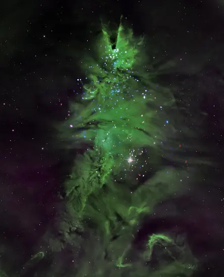 🌌 Alrededor de las estrellas, nubes de gas verde forman las "ramas" de este árbol celestial, representando luz en el espectro visible.