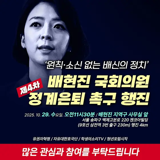 서울시 송파구민 구독자 여러분의 많은 참여 바랍니다! 2025년 10월 29일 수요일 오전 11시 30분 서울 송파구 백제고분로 220 젠코아빌딩9호선 삼전역 3번 출구에서 시작해'배현진 정계은퇴'를 외치며 4km 행진합니다. 큰 목소리는 오상종 호국단 단장님이 내주실테니 함께 행진하여 큰 힘이 되어주시길 부탁드립니다.