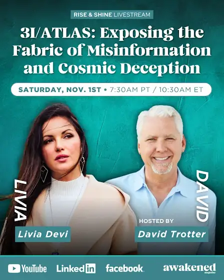 CURIOUS ABOUT 3I/ATLAS? Join Livia Devi as she exposes the fabric of misinformation and cosmic deception concerning 3I/ATLAS. Hosted by David Trotter, publisher of Awakened Magazine.