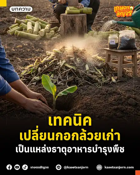 เทคนิค เปลี่ยนกอกล้วยเก่าเป็นแหล่งธาตุอาหารบำรุงพืช . หลายคนอาจเคยมอง กอกล้วยเก่า เป็นแค่เศษพืชเหลือใช้หรือขยะในสวนที่ต้องตัดและทิ้งไป แต่แท้จริงแล้ว กอกล้วยเก่ามีคุณค่าสำหรับการเกษตร เพราะนอกจากจะช่วยลดของเสียในสวนแล้ว ยังสามารถนำมาใช้บำรุงดิน ปรับโครงสร้างดินให้ร่วนซุย อุ้มน้ำดี และเสริมธาตุอาหารสำคัญให้กับสวนใหม่ ทำให้ต้นไม้หรือกล้วยต้นใหม่ที่ปลูกเติบโตแข็งแรงและให้ผลผลิตได้อย่างเต็มศักยภาพ . ทำไมกอกล้วยเก่าถึงมีประโยชน์? 1. ธาตุอาหารครบถ้วน เนื่องจากกอและรากกล้วยอุดมไปด้วย ไนโตรเจน (N), ฟอสฟอรัส (P), โพแทสเซียม (K) และธาตุอาหารรองที่ช่วยให้ดินร่วนซุย 2. ปรับปรุงโครงสร้างดิน ช่วยเพิ่มอินทรียวัตถุ ทำให้ดินร่วนซุย อุ้มน้ำดีขึ้น 3. ลดของเสีย รีไซเคิลเศษพืช ลดการเผาและทิ้งขยะในสวน . เทคนิคแปลงกอกล้วยเก่าเป็นปุ๋ยและธาตุอาหาร 1. ตัดและสับกอกล้วย เริ่มจากการตัดกอและรากกล้วยเก่าให้เป็นชิ้นขนาดประมาณ 5-10 เซนติเมตร การทำให้กอกล้วยมีขนาดเล็กลงจะช่วยให้จุลินทรีย์สามารถย่อยสลายได้เร็วขึ้น ทำให้การหมักกอกล้วยเกิดประสิทธิภาพสูงสุด 2. หมักกับเศษพืชและจุลินทรีย์ โดยนำกอกล้วยสับมาผสมกับเศษใบไม้ แกลบ หรือวัสดุเหลือใช้ทางการเกษตรอื่น ๆ เพื่อเพิ่มความหลากหลายของธาตุอาหาร จากนั้นเติมจุลินทรีย์สังเคราะห์แสง EM หรือปุ๋ยหมักสำเร็จรูป เพื่อเร่งกระบวนการย่อยสลาย ทำให้กอกล้วยเปลี่ยนเป็นปุ๋ยอินทรีย์ได้เร็วขึ้น 3. หมักแบบควบคุมความชื้น ระหว่างการหมักควรรักษาความชื้นของกองหมักให้เหมาะสม ไม่แฉะหรือแห้งเกินไป ประมาณ 50-60% เพื่อให้จุลินทรีย์ทำงานได้เต็มที่ และหมักต่อเนื่องประมาณ 3-4 สัปดาห์จนกว่ากอกล้วยจะนุ่มและย่อยสลายเป็นดินอินทรีย์ 4. เมื่อกอกล้วยหมักจนสลายแล้ว สามารถนำไปใช้เป็นปุ๋ยรองก้นหลุม หรือคลุมดินรอบต้นใหม่ได้โดยตรง ช่วยให้ต้นกล้วยต้นใหม่เติบโตเร็ว แข็งแรง และลดปัญหาการขาดธาตุอาหาร . กอกล้วยเก่าที่ผ่านการหมักแล้วสามารถนำไปผสมร่วมกับปุ๋ยหมักชนิดอื่น เพื่อเสริมความหลากหลายของธาตุอาหารและช่วยให้ดินมีชีวิตมากขึ้น เหมาะสำหรับใช้ในสวนผัก สวนผลไม้ หรือแปลงกล้วยที่ปลูกใหม่ นอกจากนี้หากพื้นที่ในสวนมีขนาดจำกัด ยังสามารถปรับวิธีหมักให้เป็นแบบปุ๋ยหมักกองสูง ซึ่งช่วยลดกลิ่น ไม่รบกวนพื้นที่ และเร่งการย่อยสลายให้เร็วขึ้น เหมาะสำหรับเกษตรกรยุคใหม่ที่ต้องการจัดการทรัพยากรในสวนอย่างมีประสิทธิภาพและเป็นมิตรต่อสิ่งแวดล้อมครับ . #กอกล้วยเก่า #รีไซเคิลกอกล้วย #ปุ๋ยหมัก #ปุ๋ยอินทรีย์ #บำรุงดิน #ปลูกก