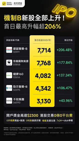 【港股IPO | 收益小結】🔥 港股IPO新規後機制B發行新股首日全部上升!最高首日升幅超206%。打新賺錢更簡單?🚩 申購方式:【TigerTrade App】-【持倉】-【IPO】✨ 老虎抽新股優勢✅ 申購0手續費,0孖展利息✅ 10倍槓桿,額度充足✅ 支援暗盤交易,快人一步搶先搶先機✅ 持牌TOP科技券商,安全可靠「老虎證券 x 貓sir投資」專屬優惠 港股0佣0平台費 | 美股期權0佣 | A股0佣 | Crypto 0佣0平台費|港股IPO0申購費0利息– 新客入金拎高達HK$2,300新人獎賞 + 額外HK$200 HKTVMALL 禮券📱貓sir投資專屬老虎開戶連結:tigr.link/1pEVDR或下載APP Tiger Trade輸入邀請碼: MT9090HK$200 HKTVMALL 禮券領取需登記表格:forms.gle/WtfcreUQDvECtQFD7============================================下載【老虎證券】:www.itiger.com/hk/download開戶前在活動中心:pse.is/77cscy輸入兌換碼【MT9090】*優惠收費設有期限並受條款及細則約束。